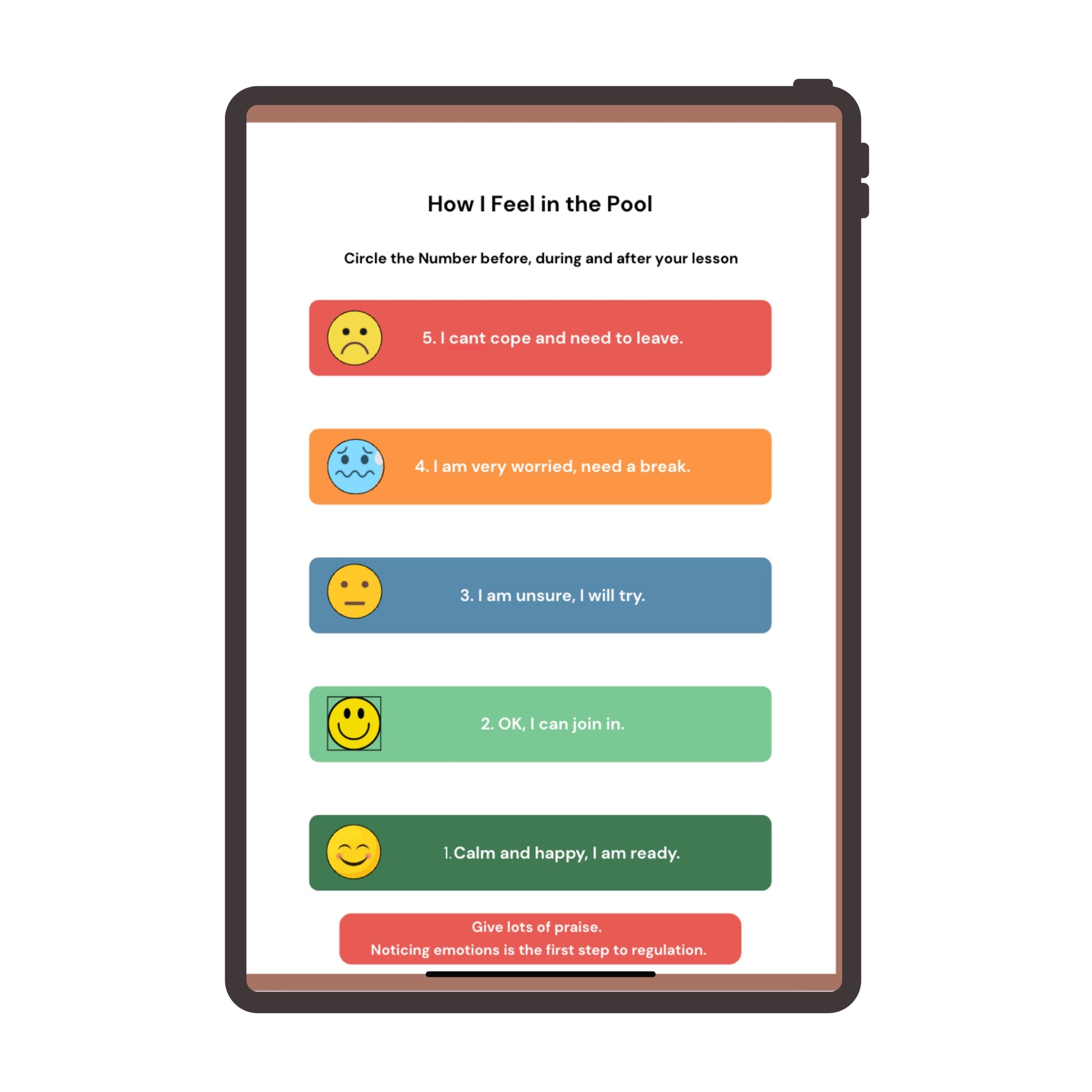 The How I Feel in the Pool Feelings Scale is a simple, child friendly tool designed to help children communicate how they are feeling at any stage of the swimming experience. The visual format gives children a safe, predictable way to express their emotions and helps adults respond supportively.